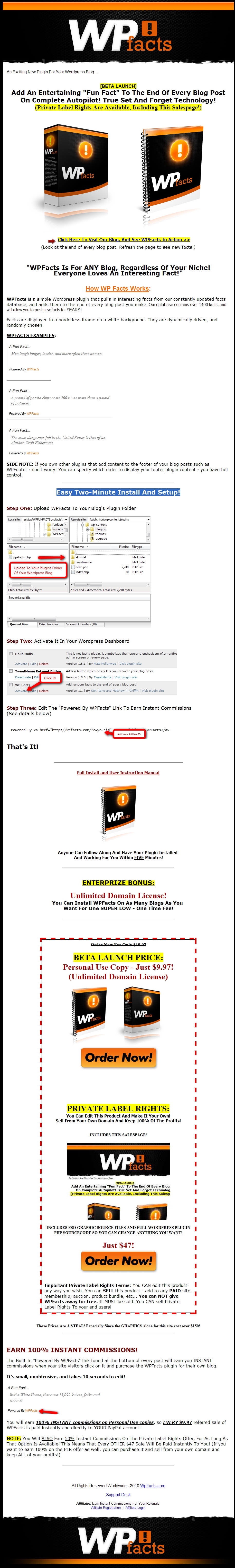WPFacts is a simple Wordpress plugin that pulls in interesting facts from our constantly updated facts database, and adds them to the end of every blog post you make. Our database contains over 1400 facts, and will allow you to post new facts for YEARS!