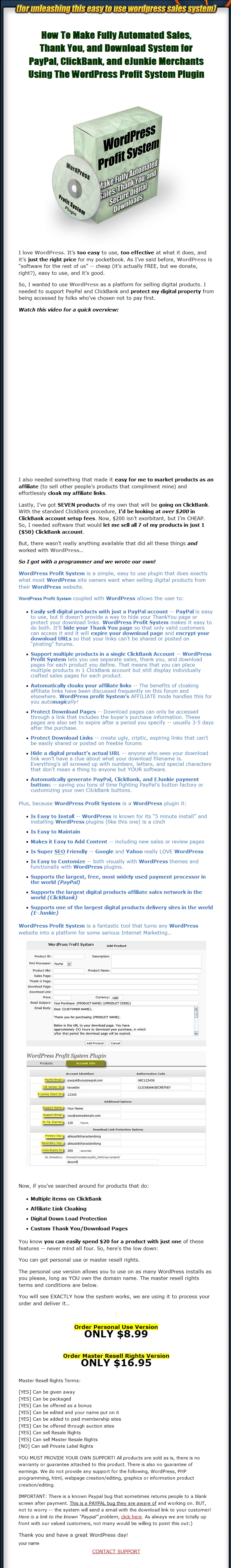 * Easily sell digital products with just a PayPal account -- PayPal is easy to use, but it doesn’t provide a way to hide your ThankYou page or protect your download links. WordPress Profit System makes it easy to do both. It’ll hide your Thank You page so that only valid customers can access it and it will expire your download page and encrypt your download URLs so that your links can’t be shared or posted on “pirating” forums.