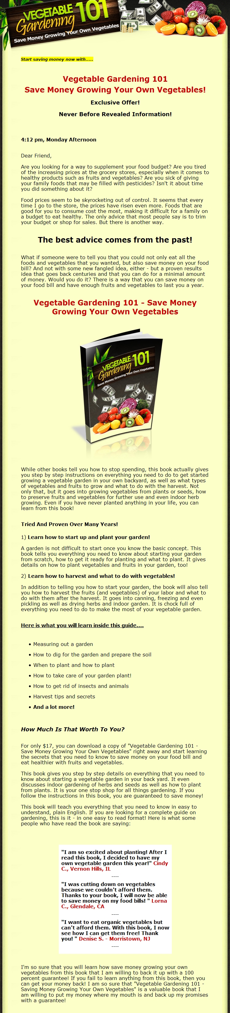 While other books tell you how to stop spending, this book actually gives you step by step instructions on everything you need to do to get started growing a vegetable garden in your own backyard, as well as what types of vegetables and fruits to grow and what to do with the harvest. Not only that, but it goes into growing vegetables from plants or seeds, how to preserve fruits and vegetables for further use and even indoor herb growing. Even if you have never planted anything in your life, you can learn from this book!