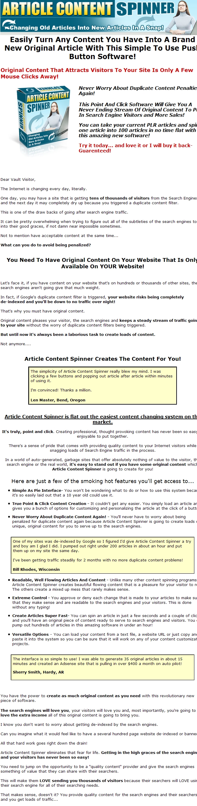Easily Turn Any Content You Have Into A Brand New Original Article With This Simple To Use Push Button Software! Original Content That Attracts Visitors To Your Site Is Only A Few Mouse Clicks Away!